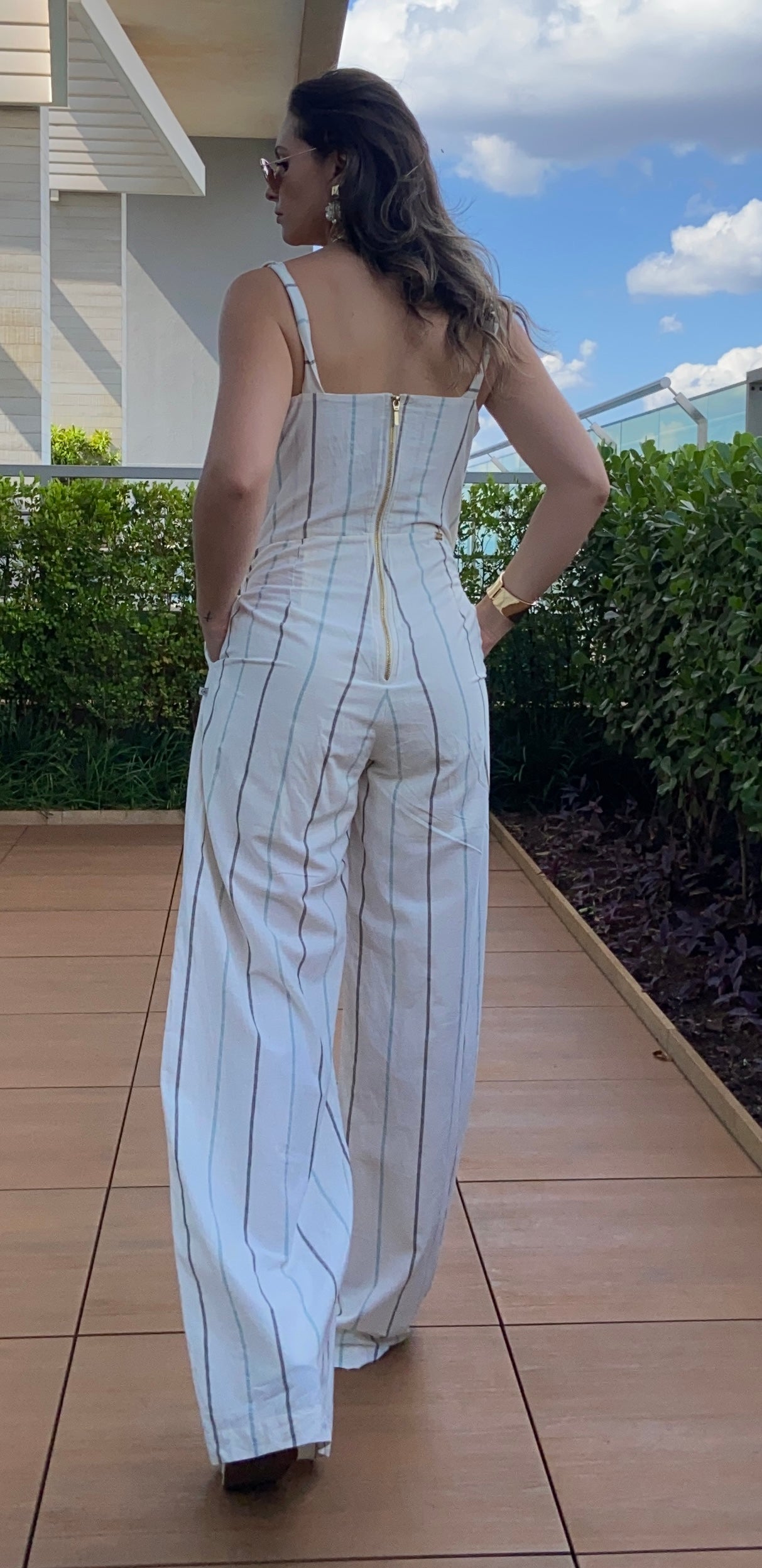 O Macacão Longo de Algodão com Listras Tom sobre Tom é a escolha perfeita para mulheres que buscam um visual leve, sofisticado e com personalidade. Confeccionado em algodão leve e respirável, ele garante um caimento confortável, ideal para os dias de calor ou produções de meia-estação.