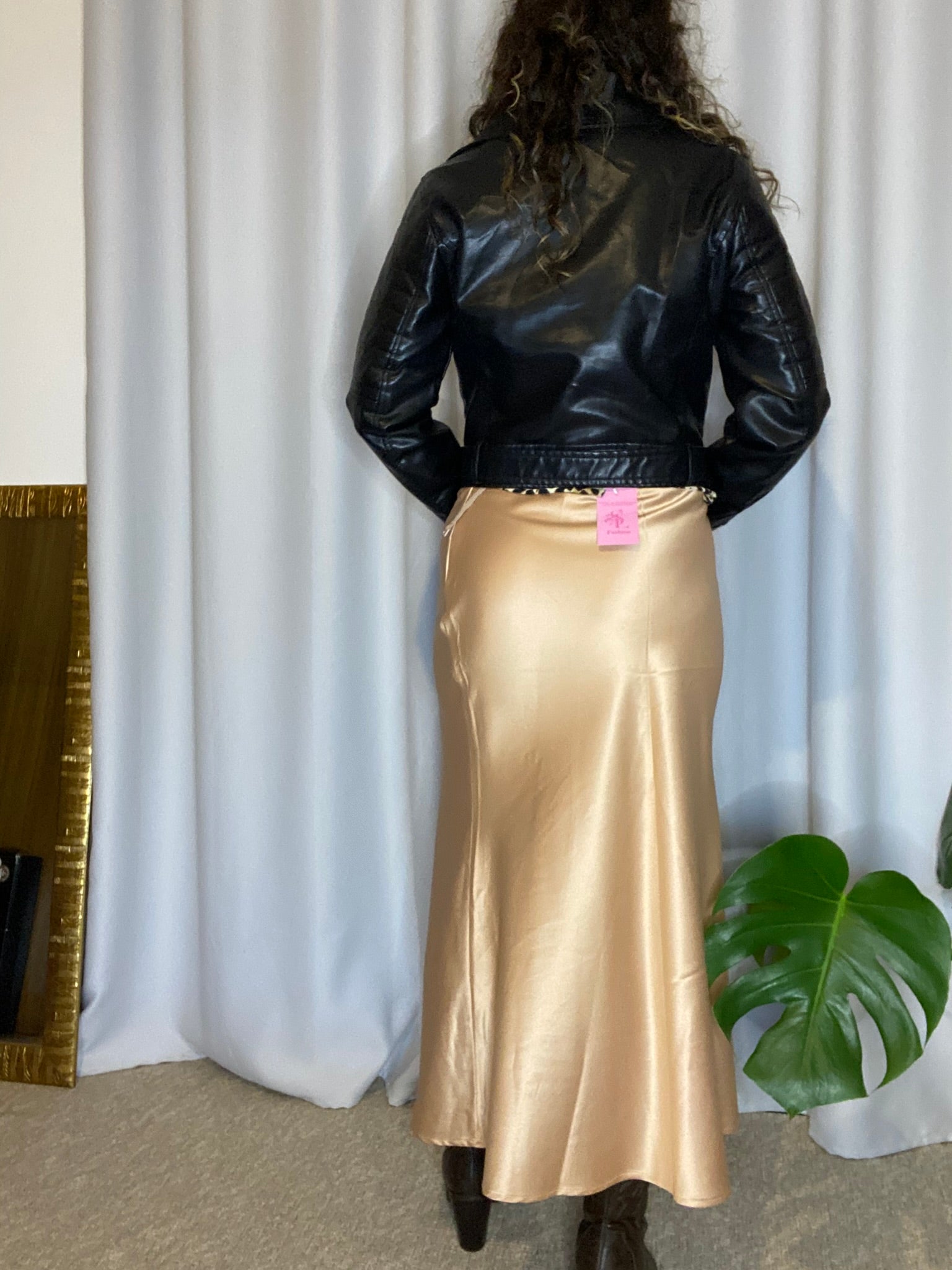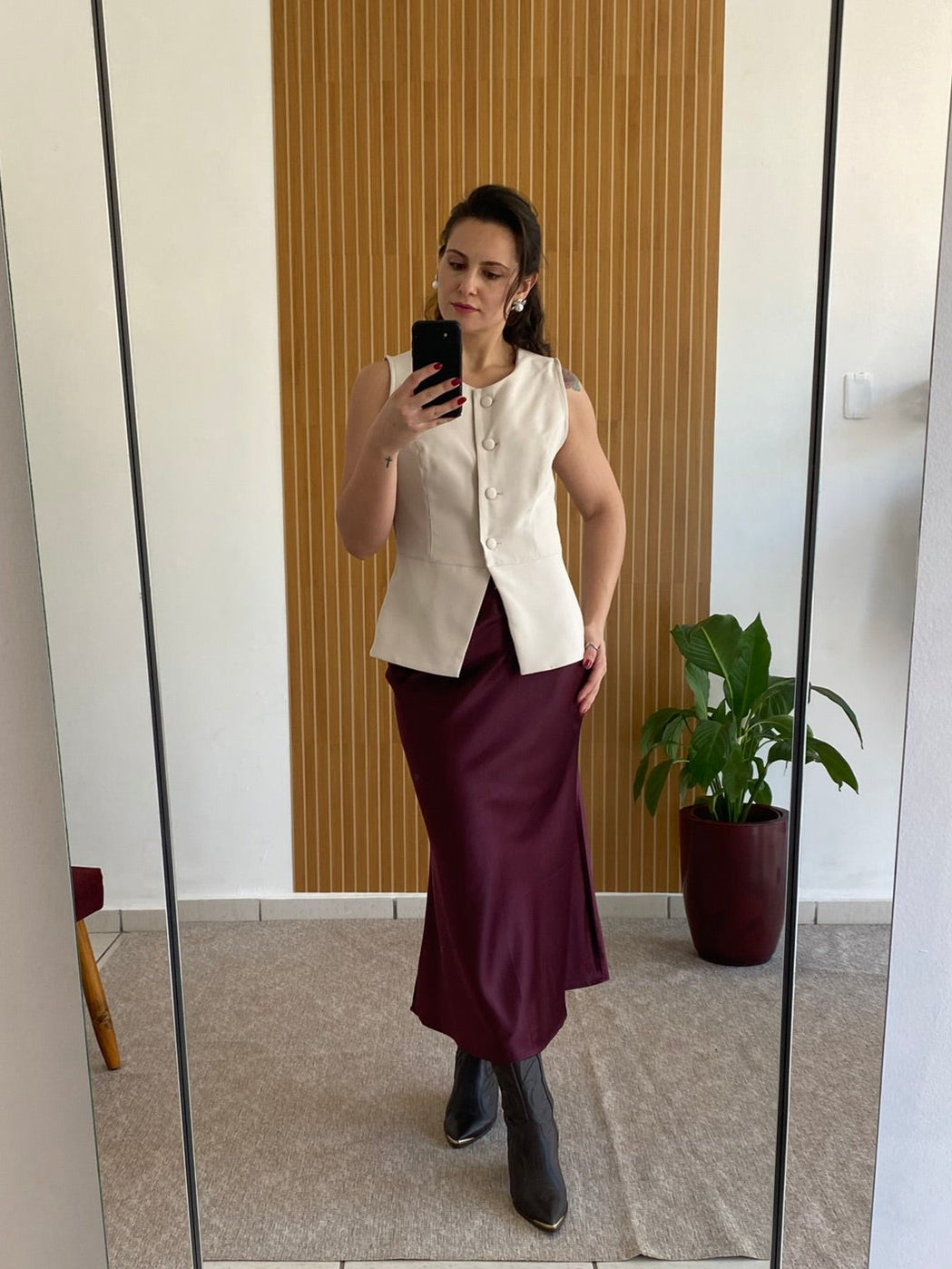 A saia midi em cetim é o toque de elegância atemporal que toda mulher precisa no guarda-roupa.