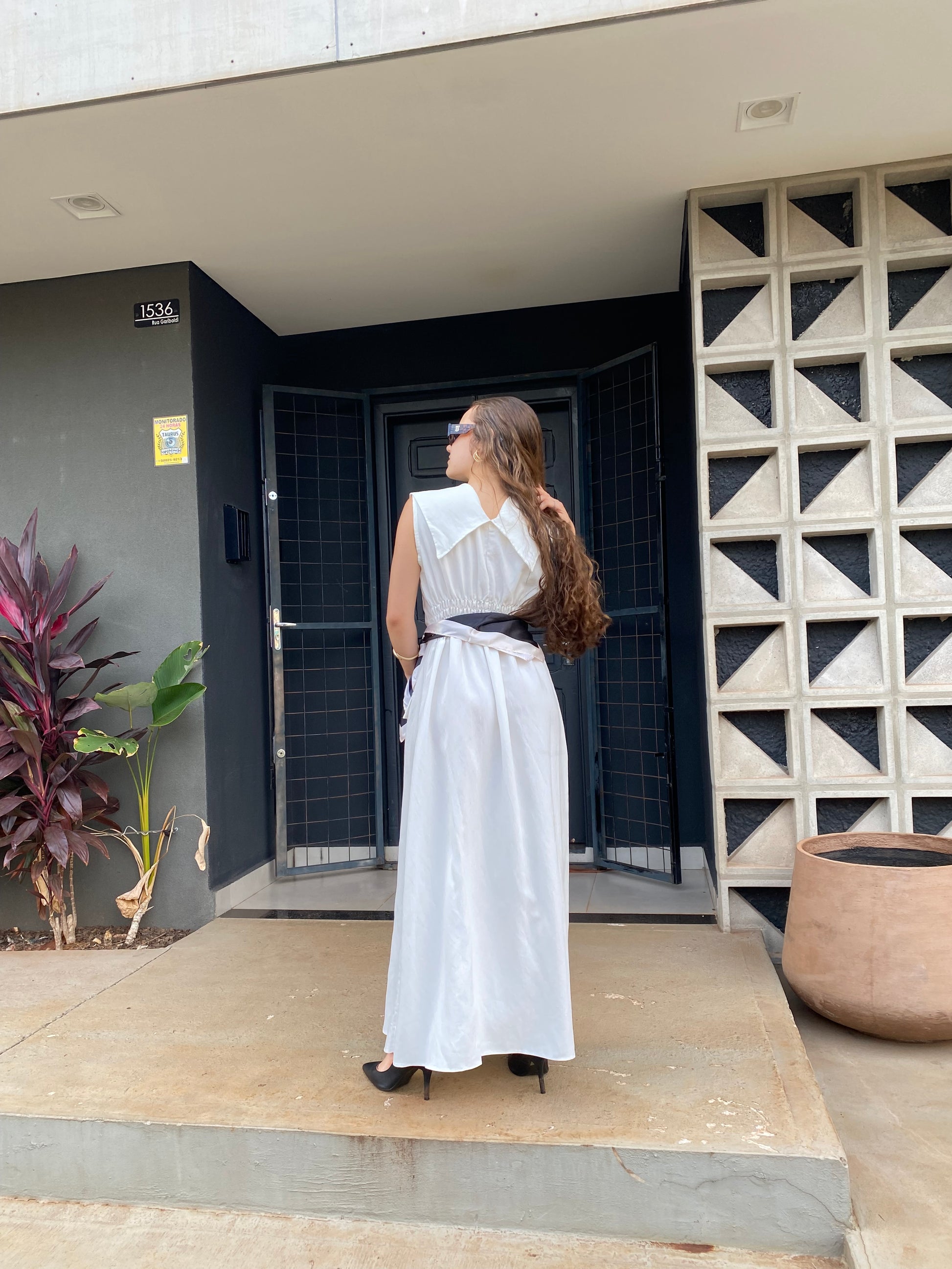 O decote reto com alças largas equilibra força e delicadeza, enquanto o comprimento midi traz harmonia e leveza.