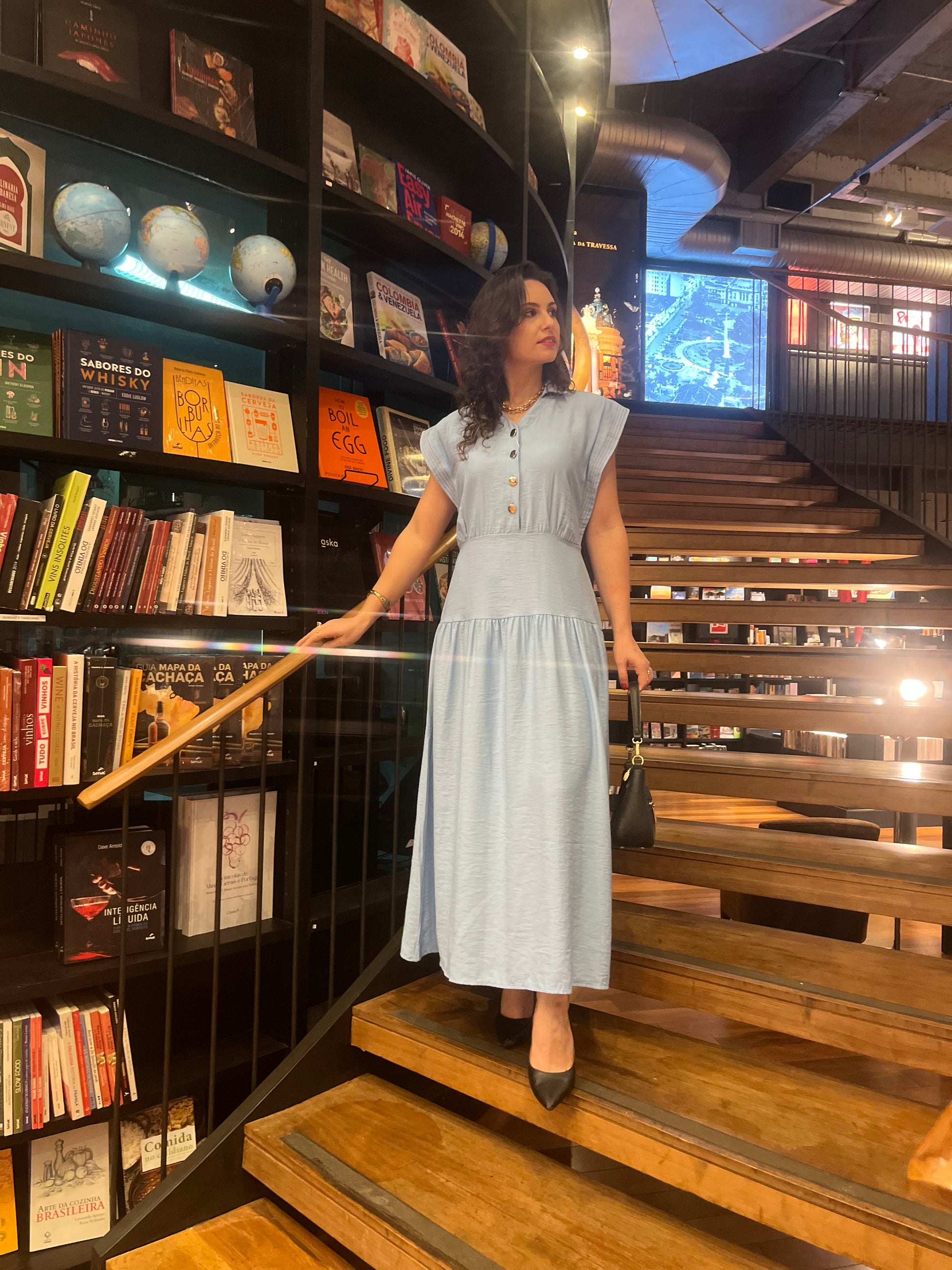 Confeccionado em tecido viscose azul de caimento impecável, esse vestido longo une elegância e leveza com design contemporâneo.